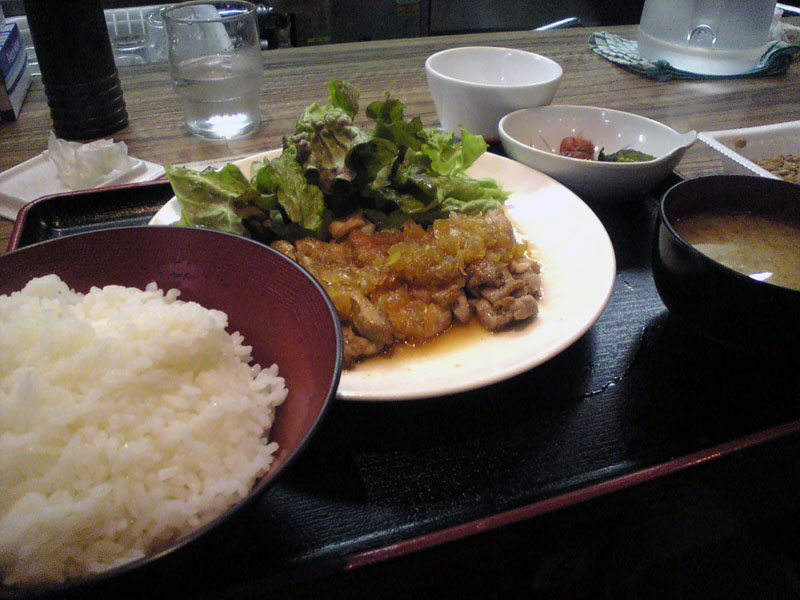 本日のオーダー、鶏肉のソテー定食480円也。