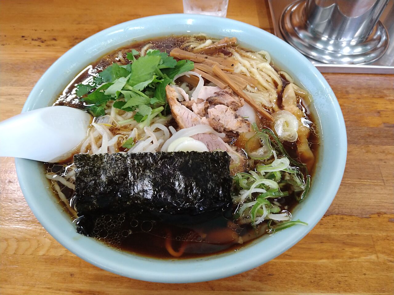 載せものは海苔3枚、大ぶりの肩ロース部位チャーシュー、ほうれん草、刻みネギ、ウズラの卵一ヶ。